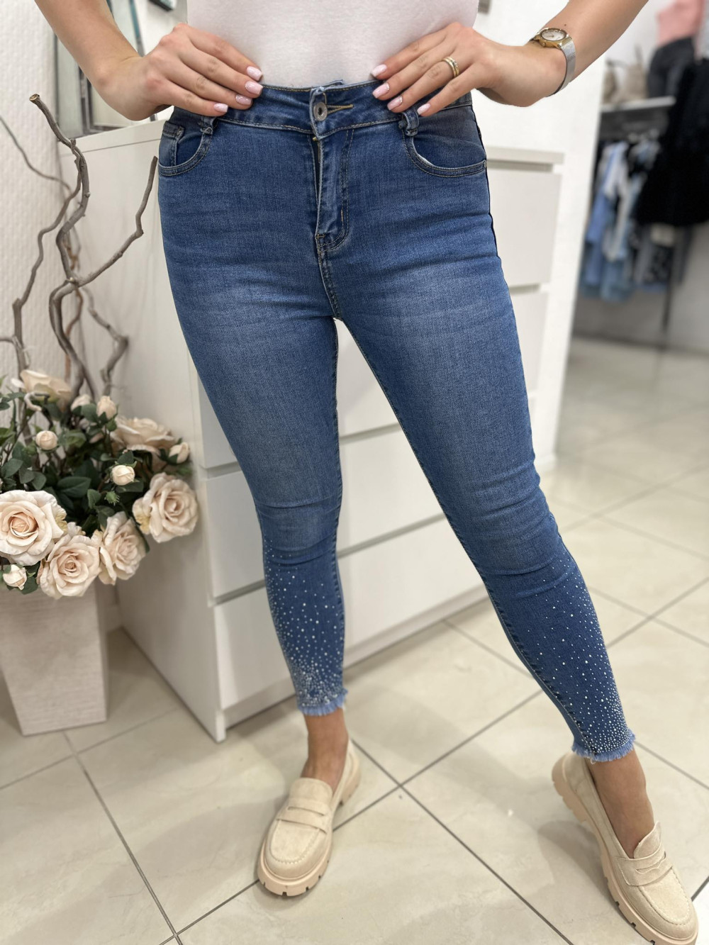 Rugalmas anyagú, normál derekú, zsebes, kövekkel díszített tavaszi farmer. A Modell 28-as méretet visel. (26-32-es méretekben.)