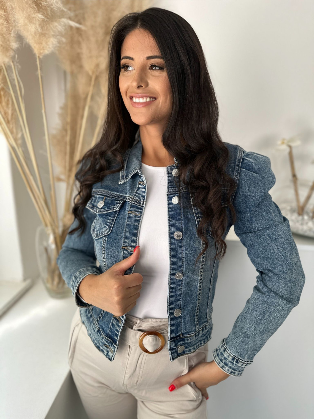 Enyhén rugalmas anyagú, béleletlen, gombos, zsebes farmerdzseki. A Modell XS méretet visel. (XS-XL méretekben.)