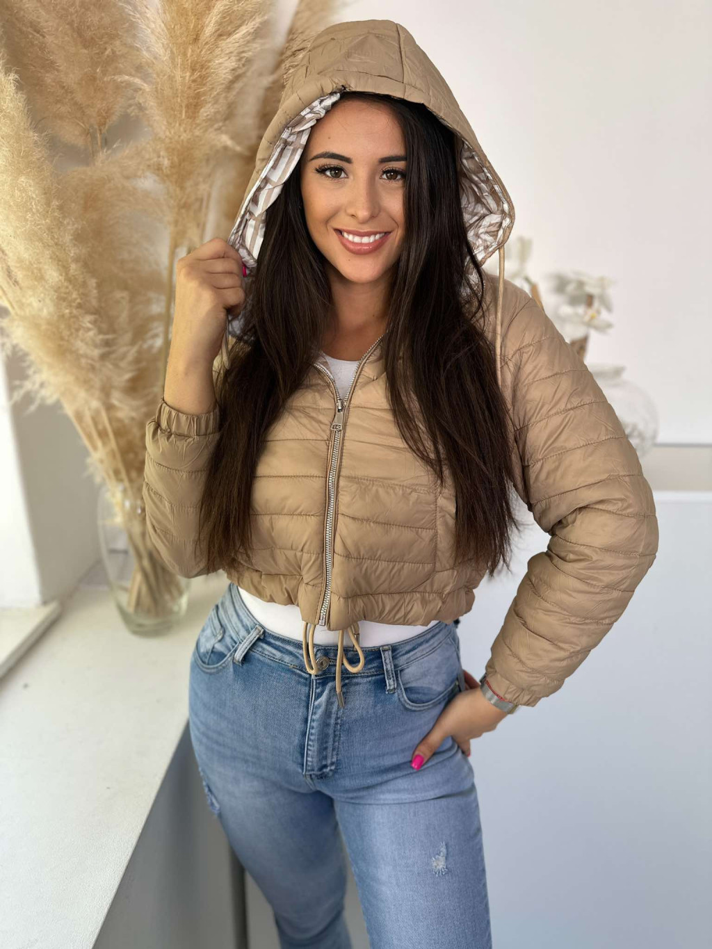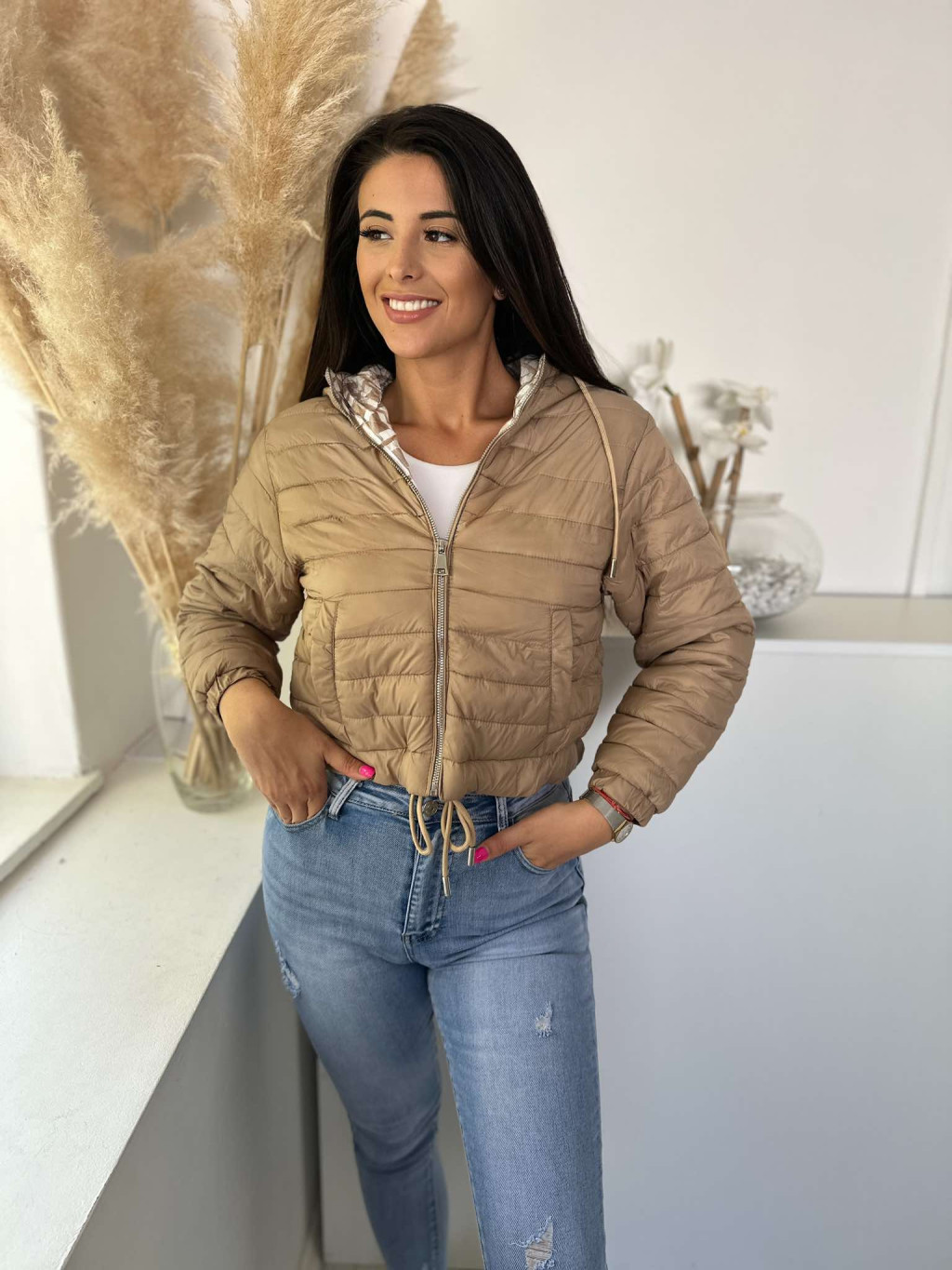 Bélelt, alul összehúzható, zsebes, kapucnis, nem rugalmas anyagú, steppelt, vékony, átmeneti kabát. A Modell S méretet visel. (S,M és L méretekben.)