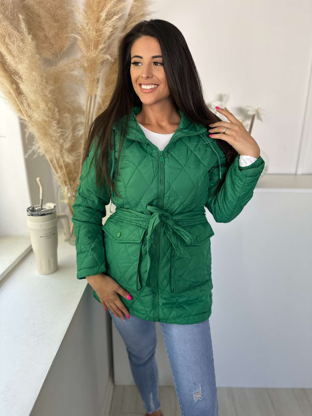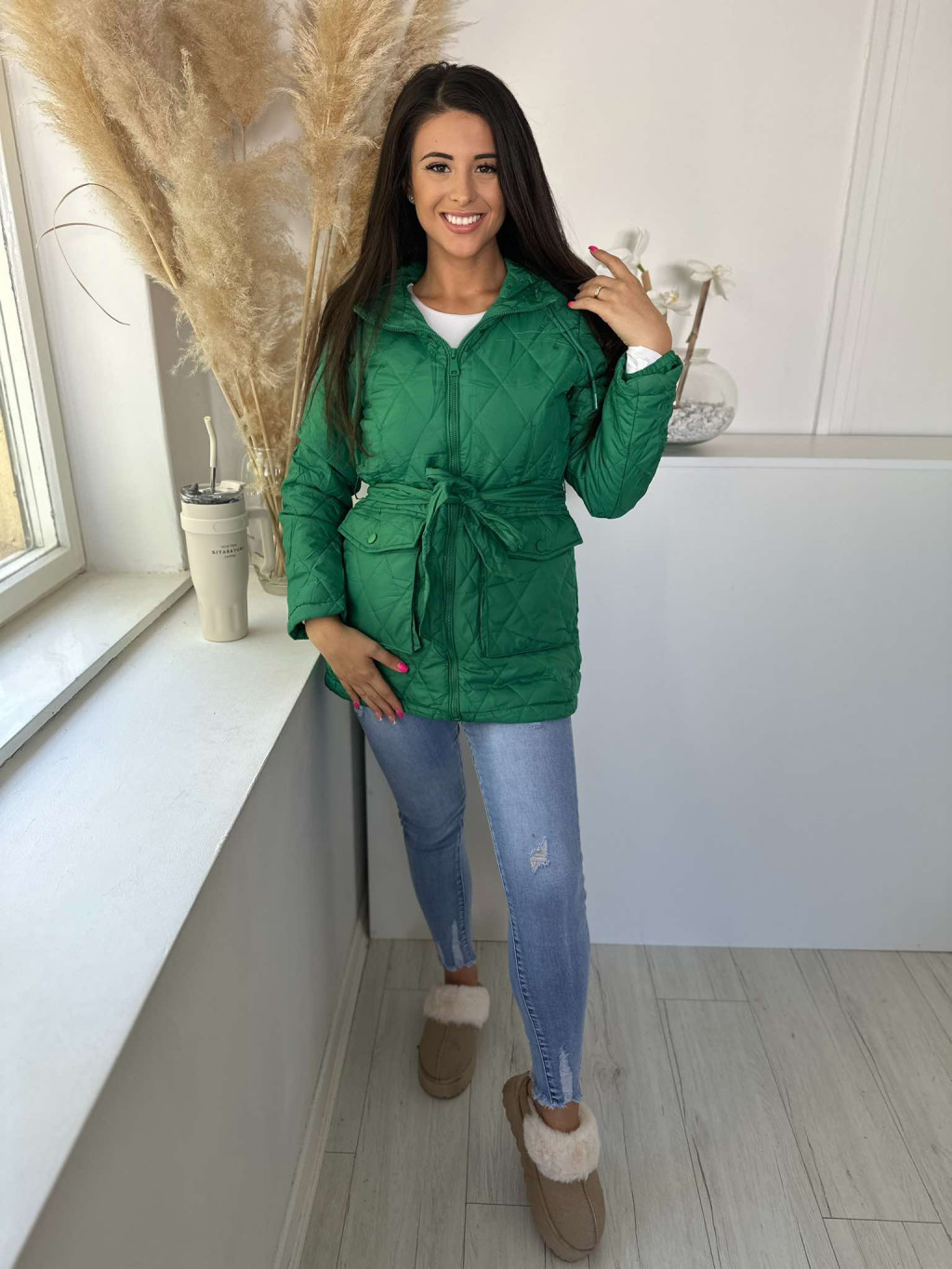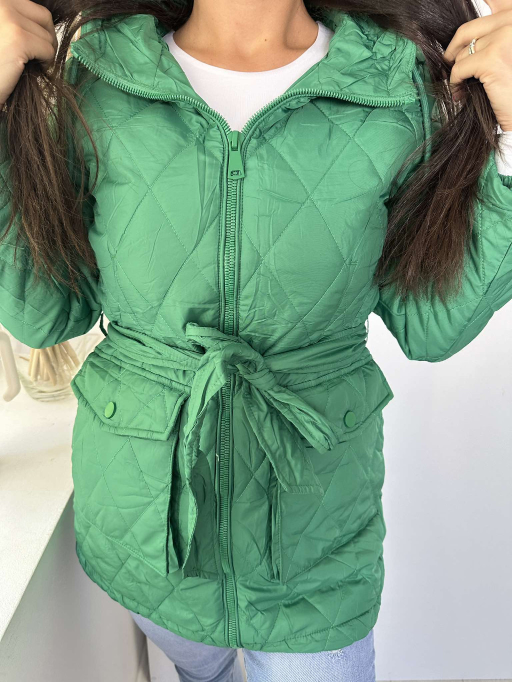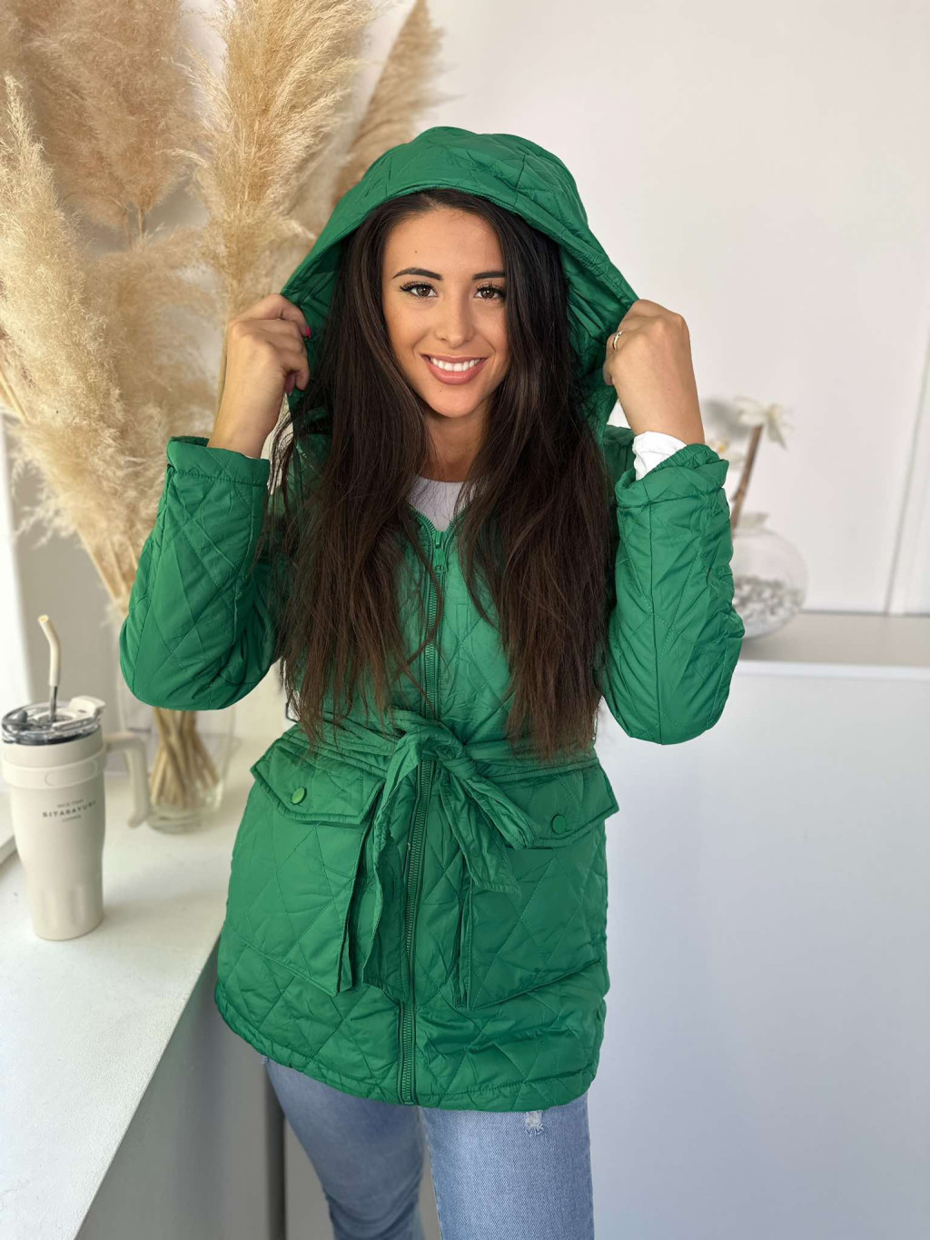 Bélelt, zsebes, kapucnis, megkötős, nem rugalmas, steppelt, vékony, átmeneti kabát. A Modell S méretet visel. (S-2XL méretekben.)